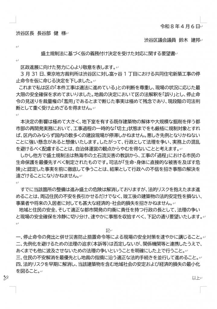 地域と住民の安全、そして適正な都市開発の均衡に責任を持つ行政の長として、法理の争いと現場の安全確保を冷静に切り分け、速やかに事態を収拾すべく、下記の通り要望いたします。